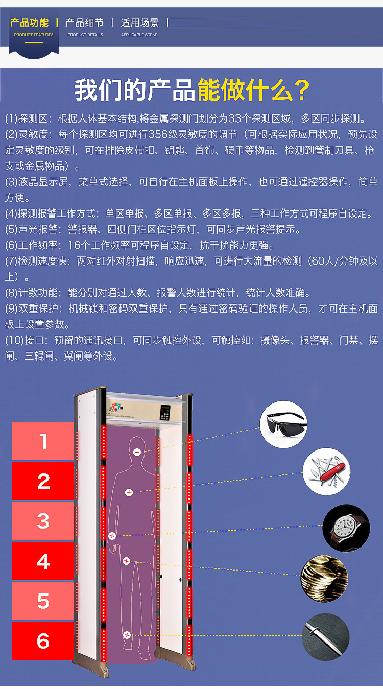 (2)、靈敏度:每個(gè)探測區(qū)均可進(jìn)行356級靈敏度的調(diào)節(jié)(可根據(jù)實(shí)際應(yīng)用狀況,預(yù)先設(shè)定靈敏度的級別,可在排除皮帶扣、鑰匙、首飾、硬幣等物品,檢測到管制刀具、槍支或金屬物品)。