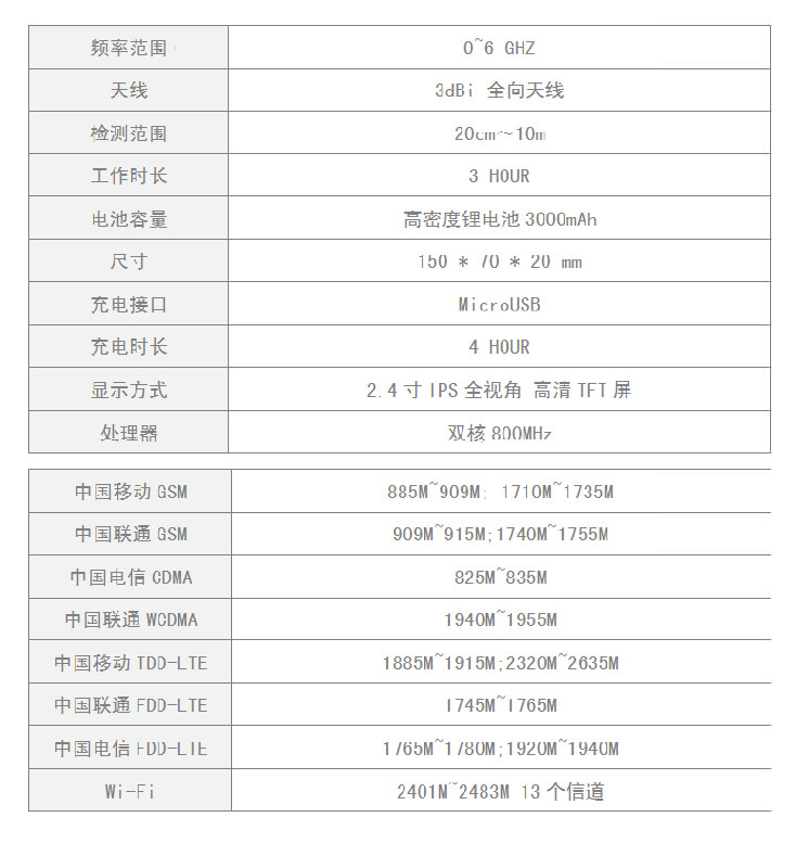 H6 無線環境分析報警系統針對國內的三大運營商的無線通訊制式與協議以及其他工頻、通信協議進行全面優化,實現高精度、高準確度的無線信號設備的定位與防范。