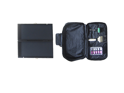 在一對(duì)烤漆金屬殼體內(nèi)裝配兩塊40cmx20cm的儲(chǔ)墨墊,分別將兩支腳踩在儲(chǔ)墨墊上,儲(chǔ)墨墊上的印油將粘附在腳底上,再用腳踩在白紙上,在白紙上就會(huì)留下清晰的腳印。