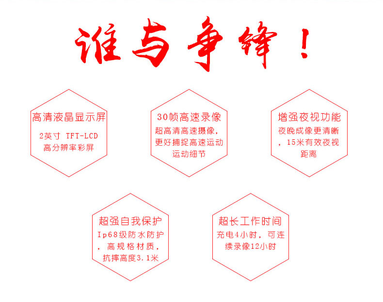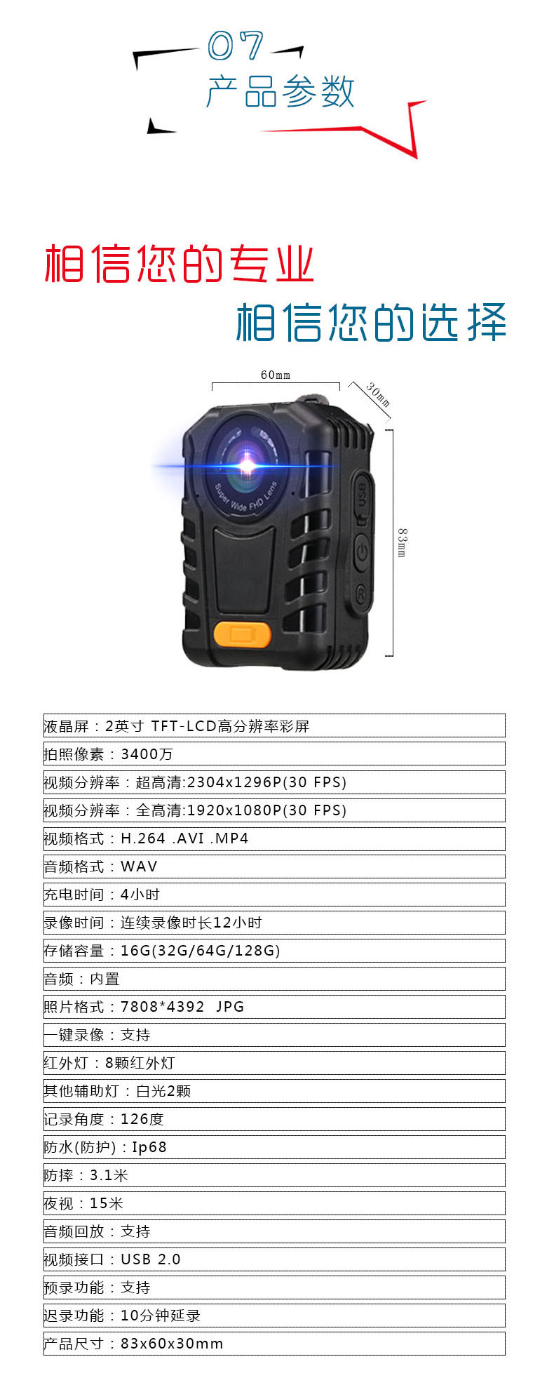 • 支持定制logo技術參數: 小塊頭 大智慧 精益求精 液晶屏 2英寸 TFT-LCD高分辨率彩屏 拍照像素 3400萬 視頻分辨率 超高清:2304x1296P(30 FPS) 視頻分辨率 全高清:1920x1080P(30 FPS) 視頻格式 H.264 .AVI .MP4 音