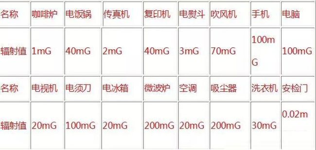 任何電子產品都有一定的電磁輻射。我們的周圍也存在著非常多的電磁輻射。比如電臺,電視臺,手機塔,高壓線,電腦,電視,微波爐,電磁爐,手機等等。上表不難看出,和其他的電子設備一樣,安檢門在使用時也會產生輻射,但是相對這些電子產品來說,安檢門的電磁輻射微乎其微。