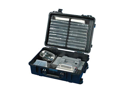 • 迷你型LED寬幅足跡燈: 燈珠:20顆大功率 LED排成一線 透鏡:半圓形玻璃柱面鏡 光型:細條狀光束 色溫:6000K 功率:60W 供電:內置7AH鋰電池 勘查箱重量:19.0kg 勘查箱尺寸:640x495x230