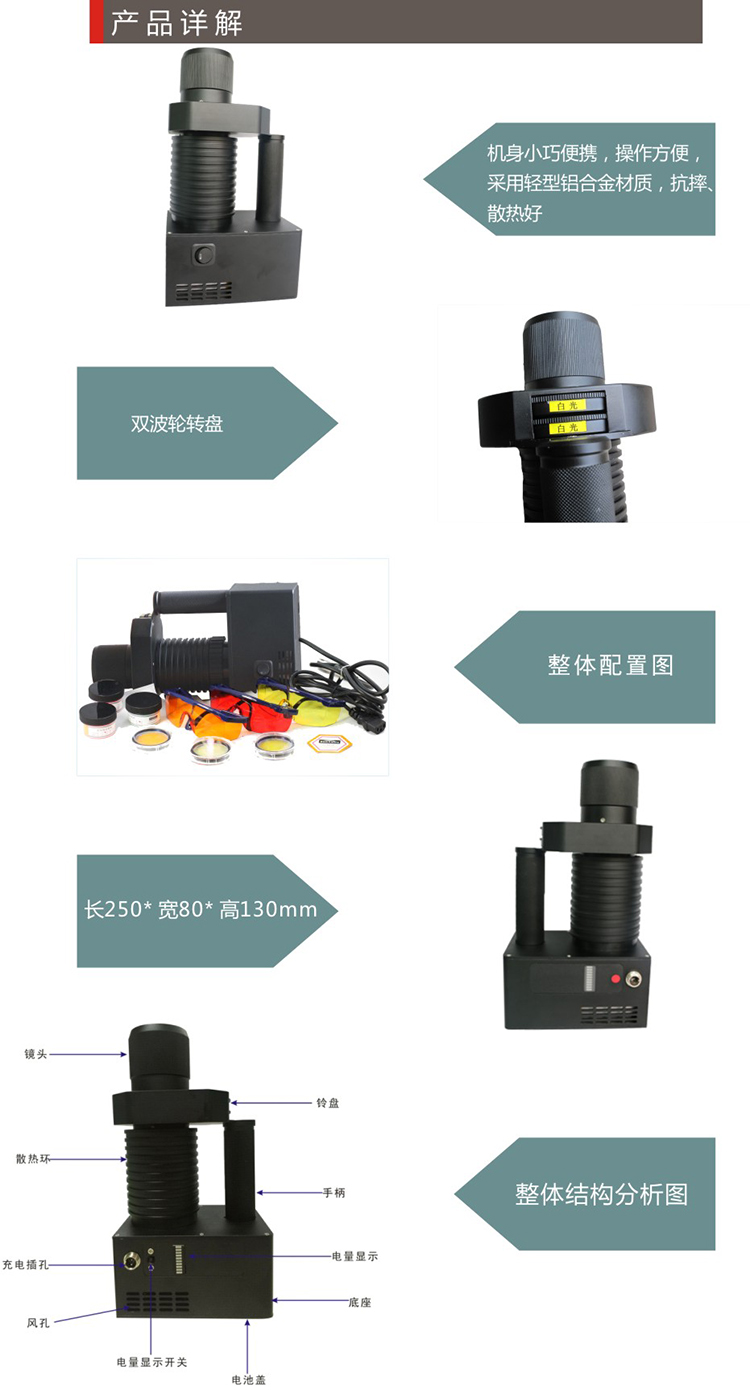 • 產品特點: KMS-BA 手持式十三波段光源采用一體化設計,主機內置大容量電池組及段質增透膜濾光片,雙波輪轉盤,機身小巧便攜,操作方便,采用輕型鋁合金材質,抗摔、散熱好。直